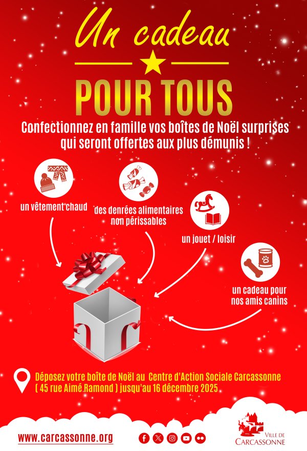 Actualité Opération « Un cadeau pour tous » : initiative solidaire pour Noël 2025 Social / Santé /Solidarité Zoom de l'image À l’approche des fêtes de fin d’année, la Ville de Carcassonne relance son opération solidaire « Un cadeau pour tous », initiée en 2020. Cette action, devenue un véritable rendez-vous de générosité pour les habitants, vise à offrir un colis de Noël aux personnes les plus démunies du territoire. Un geste simple pour offrir un peu de chaleur Jusqu’au mardi 16 décembre 2025, chaque Carcassonnais est invité à déposer un colis de Noël au Centre d’Action Sociale de la Ville de Carcassonne, situé 45 rue Aimé Ramond. Ces boîtes, préparées avec soin et bienveillance, seront ensuite redistribuées aux bénéficiaires accompagnés par les services sociaux. Des informations indispensables sur chaque colis Pour permettre aux équipes du Centre d’Action Sociale d’orienter chaque cadeau vers le bon destinataire, il est impératif que chaque paquet comporte clairement les mentions suivantes : Le contenu du colis Le profil du destinataire, à choisir parmi :• Adulte (homme ou femme)• Enfant (fille ou garçon) + âge• Animal Cette organisation garantit une distribution adaptée aux besoins et attentes des personnes qui recevront ces cadeaux. Un appel à la solidarité des Carcassonnais L’opération « Un cadeau pour tous » est l’occasion pour chacun de partager un peu de la magie de Noël avec ceux qui en ont le plus besoin. Produits d’hygiène, accessoires utiles, douceurs de saison ou petits objets réconfortants… chaque geste compte. La Ville de Carcassonne remercie chaleureusement les habitants qui participent chaque année à cette chaîne de solidarité et invite tous ceux qui le peuvent à rejoindre cette belle initiative.