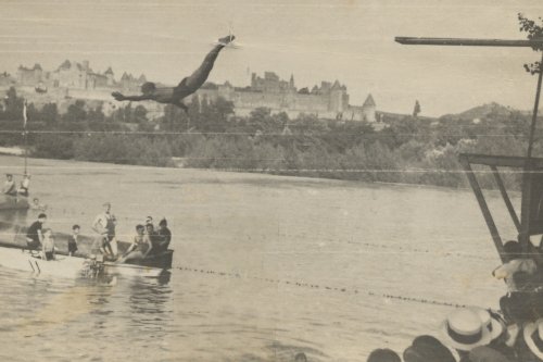 Les premiers balbutiements d’un club de natation à Carcassonne remontent à 1928 avec le « Sauvetage de l’avenir », mais il faut attendre le 25 avril 1934 pour que le premier club structuré voit le jour. Il s’agit des « Tritons de la Cité » placés sous la présidence de l’architecte départemental M. Bourely et la vice-présidence du Dr Lauze. L’association siège au Café de la Comédie et à la guinguette du Païchérou. À cet endroit, dénommé ainsi en raison de sa proximité avec la païchère construite par Henry Bouffet, les membres du club aménagent dans le fleuve avec les moyens du bord, une piscine flottante avec ligne d’eau, plongeoir, planches de virages… Au début des années 1930, les Carcassonnais n’ont guère l’occasion ni les moyens d’aller à la mer. C’est dire si bien peu de gens savent nager. Toutefois, grâce aux Tritons de la Cité, les écoliers de moins de seize ans peuvent passer le brevet de nageur scolaire. Au moment des compétitions, dont certaines ont lieu en nocturne, une vaste tribune en bois et trois rangées de chaises sont disposées au bord de l’Aude en face de la guinguette. Malgré les efforts des dirigeants du club, l’engouement pour les compétitions de natation à Carcassonne reste encore marginal après guerre et la municipalité préfère investir pour le rugby à XIII, plutôt que construire une piscine.