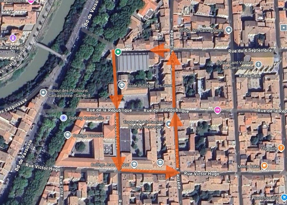 Actualité Une fresque artistique monumentale en cœur de Bastide Culture Zoom de l'image Du 7 au 10 octobre 2025, les escaliers menant au gymnase des Serres, rue du 4 septembre, vont se transformer en une véritable œuvre d’art grâce au projet Graff it XXL, porté par l’association One-One et son directeur Camille Casteignau, dans le cadre de l’appel à projets du contrat de ville Engagement Quartiers 2030. Une œuvre signée RESO et Julia Forma La fresque, mêlant figuratifs, abstractions et couleurs vives, sera réalisée par deux artistes de renommée : RESO (Cédric Lascours), grapheur reconnu sur la scène internationale (découvrir son univers) Julia Forma, peintre muraliste aux créations poétiques et immersives (voir son travail) Le choix du site n’est pas anodin : cet escalier marque une entrée stratégique de la Bastide, à proximité de la nouvelle gare routière desservant les établissements scolaires et dynamisant la vie urbaine. Un projet collectif La Ville porteuse de ce projet aux côtés des autres institutions partenaires (État, Région, Agglo, Alogea) s’est fortement investie dans sa réalisation, en apportant un soutien financier de 3 000 € ainsi qu’un appui logistique, notamment à travers la rénovation des escaliers dans le cadre du dispositif Action Cœur de Ville. Les établissements scolaires du quartier sont pleinement associés : L’école élémentaire des Serres, Le lycée Paul Sabatier,participent à des rencontres et ateliers de création avec les artistes, permettant aux élèves de découvrir l’art urbain et de contribuer à la transformation de leur cadre de vie. Calendrier des travaux et fermeture de l’escalier Afin de garantir la bonne réalisation du projet, l’escalier du gymnase des Serres sera temporairement fermé : Jeudi 2 et vendredi 3 octobre 2025 : pose d’une sous-couche de protection → fermeture complète (séchage optimal). Du mardi 7 au vendredi 10 octobre 2025 inclus : réalisation de la fresque → fermeture intégrale durant toute la durée des travaux. Déviations mises en place Piétons : accès au gymnase par la rue Jules Sauzède, via la rue de la Liberté ou la rue de la République, puis par le bas de l’escalier. Véhicules : report sur itinéraire indiqué par le plan de circulation (voir ci-dessous). Zoom de l'image