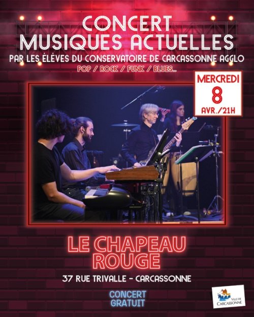 Agenda des manifestations Concert Musiques Actuelles [Pop Rock, Funk, Blues...] Chapeau Rouge Musique Le Chapeau Rouge mercredi 8 avril 21h00 Le Chapeau Rouge Par les élèves du Conservatoire de Carcassonne Agglo. Venez découvrir le travail des ateliers des cycles 2 et 3 du département des musiques actuelles du Conservatoire à Rayonnement Départemental de Carcassonne Agglo, pour un concert le 8 avril 2026 à 21h. Pour cette soirée, les élèves, accompagnés de leurs professeurs, investiront la scène afin de se produire et de partager avec le public le fruit de leur travail mené tout au long de l’année. Ce concert sera l’occasion de mettre en lumière leur engagement, leur progression artistique et la richesse pédagogique du département. Venez apprécier un répertoire éclectique et accessible, mêlant pop, rock, funk, blues, reggae et autres esthétiques des musiques actuelles, offrant ainsi un moment convivial et fédérateur, ouvert à tous les publics, amateurs comme curieux. Sur le Web www.fabriquedesarts.fr/conservatoire Zoom de l'image Gratuit dans la limite des places disponibles Votre contact PAC Billetterie Centre de Congrès du Dôme Entrée parking du Dôme Du lundi au jeudi de 10h à 12h30 et de 14h à 17h30 Le vendredi de 10h à 12h30 - Fermé l'après-midi 04 68 11 59 15 pacbilletterie@mairie-carcassonne.fr pac-billetterie.tickandlive.com