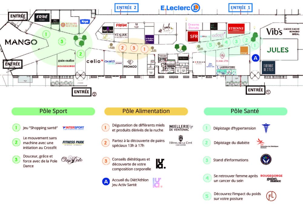 Agenda des manifestations Diét'Athlon Autres Social / Santé /Solidarité samedi 14 mars de 10h00 à 17h00 Rocadest, 2 rue Joséphine Baker, 11000 Carcassonne Le Diet'Athlon par Laura Tajan vous accueille à Rocadest ! Participez à cette journée de prévention sport, santé et nutrition. Plan des différents pôles Zoom de l'image Zoom de l'image Gratuit