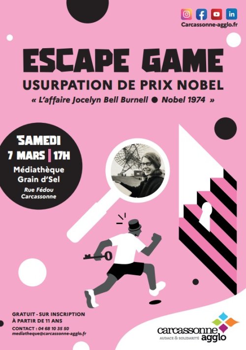 Agenda des manifestations Escape game – Usurpation de prix Nobel Médiathèque Grain d'sel Attraction - Jeux Médiathèque Grain d'Sel samedi 7 mars de 17h00 à 23h00 Médiathèque Grain d'Sel Zoom de l'image Les médiathèques proposent un escape game basé sur la controverse autour de Jocelyn Bell et l’attribution du prix Nobel de physique de 1974, dans le cadre de la journée internationale des droits des femmes 2026. Le monde de la recherche est impitoyable, les idées reçues et l’ordre établi de longue date empêchent des scientifiques de valeur de se voir reconnues et valorisées. Nous avons besoin de vous, de votre sens de l’observation et de votre esprit aiguisé pour transmettre de précieuses informations scientifiques sans éveiller aucun soupçon. Sur inscription, à partir de 11 ans. Zoom de l'image Gratuit Contact Médiathèque Grain d'sel 04 68 10 35 50 mediatheque@carcassonne-agglo.fr Agenda