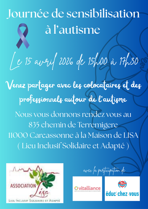 Agenda des manifestations Journée de sensibilisation à l'autisme Atelier - Stage mercredi 15 avril 15h00 835 chemin de Terremigère, 11000 Carcassonne Les colocataires et les professionnels qui interviennent à la Maison de LISA, habitat inclusif partagé situé à Carcassonne, vous proposent une sensibilisation à l’autisme, avec un atelier de mise en situation avec le Kit ABC : Le Kit ABC (Autisme Bien Comprendre) est un ensemble de ressources pédagogiques conçu pour favoriser la compréhension du Trouble du Spectre de l'Autisme (TSA). Ce kit propose une approche immersive qui permet aux participants de vivre des expériences concrètes, leur offrant ainsi une perspective unique sur la cognition et les émotions des personnes autistes. L'objectif est de sensibiliser les participants aux défis quotidiens que rencontrent les personnes autistes, tout en développant leur empathie et leur compréhension des besoins spécifiques liés à l'autisme. un powerpoint qui présente les activités des colocataires des témoignages des auxiliaires de vie un atelier confection de « rubans bleus » un goûter offert par Vitalliance Zoom de l'image