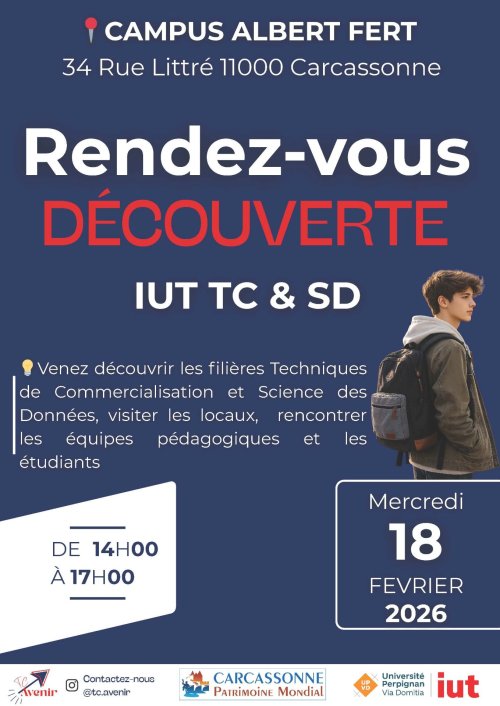 Agenda des manifestations Journée portes ouvertes : Campus Albert Fert IUT tc & sd Portes ouvertes mercredi 18 février de 14h00 à 17h00 Campus Albert Fert Le Campus Albert Fert ouvre ses portes Venez découvrir les filières : Techniques de Commercialisation Science des Données Visiter les locaux, rencontrer les équipes pédagogiques et les étudiants Zoom de l'image