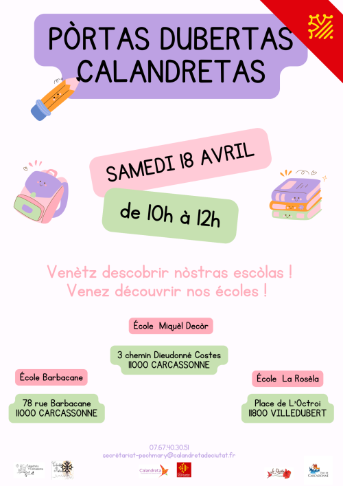 Agenda des manifestations Portes Ouvertes des Calandretas Portes ouvertes samedi 18 avril de 10h00 à 12h00 Dans les 3 écoles de Carcassonne et Villedubert Les calandretas vous proposent un moment de rencontre et d'échanges avec l'équipe pédagogique et associatives à l'occasion de ses portes ouvertes qui auront lieu le samedi 18 avril 2026 de 10h à 12h dans les écoles de Barbacane, Miquel Décor et la Rosela. Zoom de l'image Votre contact Calandreta de Carcassona 07 67 40 30 51 communication@calandretadeciutat.fr www.calandretadeciutat.fr