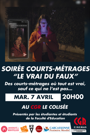 Agenda des manifestations Projections de courts-métrages : le vrai du faux Cinéma Cinéma le Colisée Tourisme - Loisirs mardi 7 avril 20h00 Cinéma le Colisée Pour la quatrième année consécutive, le cinéma Le Colisée accueille la séance de courts-métrages sélectionnés et présentés par les élèves de la faculté d'éducation. 8 courts métrages où tout est vrai sauf ce qui ne l'est pas... À l’heure où les fake news, les rumeurs et la manipulation des images se répandent à toute vitesse, interrogeons-nous sur le « vrai » et le « faux » et la porosité entre ces deux notions.Du petit mensonge de la vie quotidienne à la désinformation massive, il existe plusieurs formes de confusion entre le réel et le fantasmé. À travers 8 courts-métrages, découvrez comment le cinéma, art de l’image et de la fiction, s’empare de ces questions. Une soirée animée par les étudiantes, étudiants et personnels de la Faculté d’Éducation – site de Carcassonne ayant participé à l’atelier « Programmation de courts métrages » animé par Jacob Redman. Tout au long de l'année, ils et elles ont analysé, discuté, défendu leurs coups de cœurs, écouté les arguments de chacune et chacun, et trouvé un consensus pour proposer une sélection finale riche et variée afin de la présenter au grand public. Cette soirée sera l’occasion d’échanger sur leur sélection et de partager un moment de convivialité. Les films diffusés : Imagine de Anna Apter Mort d'un Acteur de Ambroise Rateau L'Immoral de Ekin Koca Night Out de Elliot et Valentin Clarke Tu préfères rendre l'argent ou créer plus de bonheur sur cette terre ? de Lise Akoka et Romane Guéret Quota de Marieke Blaauw Joris Oprins et Job Roggeveen L'Américain de Maxime Renard Amour et faux-semblants de Lorca Alonso Cet événement est proposé par le service arts & culture – Direction Vie des campus de l’Université de Montpellier en partenariat avec la Faculté d’Éducation, Les Amis du Cinoch’, KOVisuel, Cinéma CGR et la Ville de Carcassonne. Zoom de l'image Tarif(s) 5€ Votre contact Cinéma le Colisée Boulevard Omer Sarraut www.cgrcinemas.fr/carcassonne-colisee