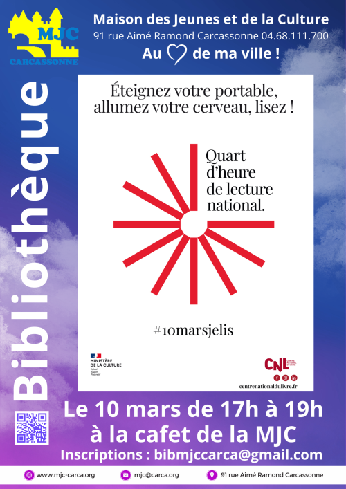 Agenda des manifestations Quart d'heure national de lecture Autres MJC de Carcassonne mardi 10 mars de 17h00 à 19h00 MJC de Carcassonne La bibliothèque de la MJC participe pour la deuxième fois à la manifestation nationale #10marsjelis. En quoi consiste-t-elle?Partager des moments de lecture à voix haute, partager le plaisir de lire. Les modalités sont les suivantes : Le 10 mars 2026 à la MJC de Carcassonne de 17h à 19h :Si j’ai déjà choisi un texte de fiction à lire (roman, nouvelle, théâtre, poésie), je m’inscris à l’adresse mail suivante et je lirai entre 17h et 18h : BibMjcCarca@gmail.com Mon texte ne doit pas excéder 2-5 mn. Je peux présenter l’auteur en quelques mots. Si je n’ai pas d’idée, si je préfère improviser, la bibliothèque mettra à ma disposition un choix de textes variés et je lirai entre 18h et 19h. En espérant de nombreux retours. Zoom de l'image Gratuit Votre contact MJC - Maison des Jeunes et de la Culture 04 68 11 17 00 mjc@carca.org mjc-carca.org