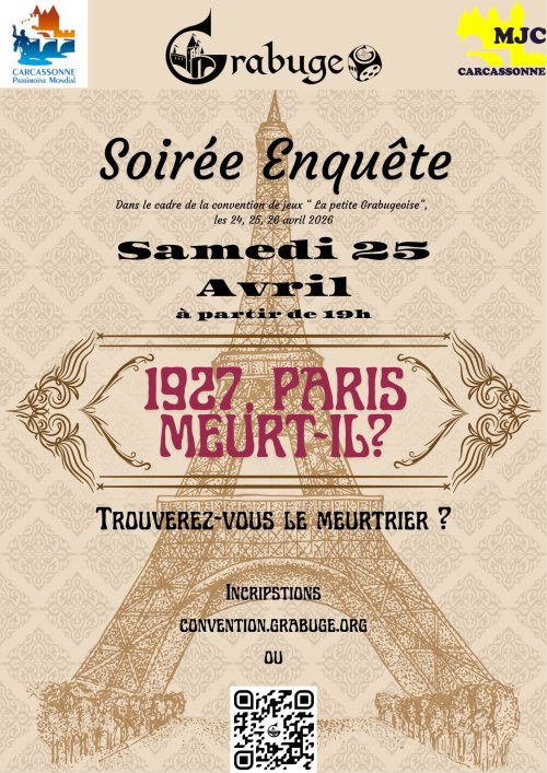 Agenda des manifestations SoirĂ©e enquĂŞte - Convention Grabuge Attraction - Jeux MJC de Carcassonne samedi 25 avril 19h00 MJC de Carcassonne đźŽđźĄ‚ Invitation – SoirĂ©e EnquĂŞte : 🎩🔍 Monsieur Hautecour,financier de renom et grand mĂ©cène des arts,a le plaisir (et peut-ĂŞtre l’audace…) de vous convier Ă une rĂ©ception exceptionnelle en sa demeure parisienne. Une expĂ©rience pas comme les autresCette soirĂ©e prendra la forme d’une soirĂ©e enquĂŞte : un jeu immersif oĂą chaque convive incarne un personnage.Secrets Ă garder, vĂ©ritĂ©s Ă dĂ©couvrir, alliances Ă former… et peut-ĂŞtre quelques mensonges Ă glisser habilement.Observez, questionnez, jouez votre rĂ´le avec panache — et surtout, mĂ©fiez-vous des apparences… Le dĂ©cor : les AnnĂ©es FollesEn cette pĂ©riode d’effervescence oĂą Paris brille de mille feux, artistes, Ă©crivains et personnalitĂ©s influentes se rĂ©unissent pour cĂ©lĂ©brer la vie retrouvĂ©e. Au cĹ“ur de cette nuit prometteuse, Monsieur Hautecour annoncera une rĂ©vĂ©lation qui, selon ses propres mots, pourrait faire trembler l’Europe entière… Une promesse ambitieuse… ou dangereuse ? Serez-vous fin enquĂŞteur, manipulateur de gĂ©nie… ou au cĹ“ur du mystère ? ==> Samedi 25 avril Ă la MJC de Carcassonne, dans le cadre de la convention Grabuge « La petite Grabugeoise »- Horaire : 19 h- Tarif : 10 € (une collation sera proposĂ©e pendant la soirĂ©e)- 26 places maximum- Inscription ici : https://convention.grabuge.org/page/murder/inscription-murder Zoom de l'image Tarif(s) 10€ (comprend une collation lors de la rĂ©ception et le jeu de la soirĂ©e) Votre contact MJC - Maison des Jeunes et de la Culture 04 68 11 17 00 mjc@carca.org mjc-carca.org