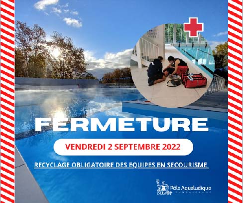 A exporter Activé date panneau mar 30/08/2022 - 12:00 date panneau fin ven 02/09/2022 - 12:00 ligne 1 Fermeture du ligne 2 Pôle Aqualudique le ligne 3 vendredi 2 septembre ligne 4 pour le recyclage ligne 5 obligatoire des ligne 6 équipes de ligne 7 secourisme. image panneau Afficher seulement image Désactivé Type de manifestation Autres