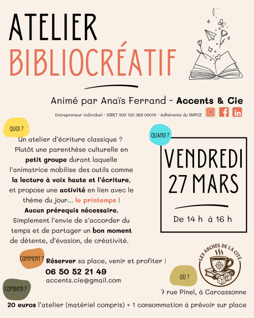 Agenda des manifestations Atelier bibliocréatif Atelier - Stage vendredi 27 mars de 14h00 à 16h00 Les arches de la Cité, 7 rue Pinel 11000 Carcassonne Un atelier d’écriture classique ? Plutôt une parenthèse culturelle en petit groupe durant laquellel’animatrice mobilise des outils comme la lecture à voix haute et l’écriture, et propose une activité en lien avec le thème du jour... l’amour ! Aucun prérequis nécessaire. Simplement l’envie de s’accorder du temps et de partager un bon moment de détente, d’évasion, de créativité. Animé par Anaïs Ferrand - Accents & Cie Réservez votre place : 06 50 52 21 49 - accents.cie@gmail.com Zoom de l'image Tarif(s) 20 euros l’atelier (matériel compris) + 1 consommation à prévoir sur place