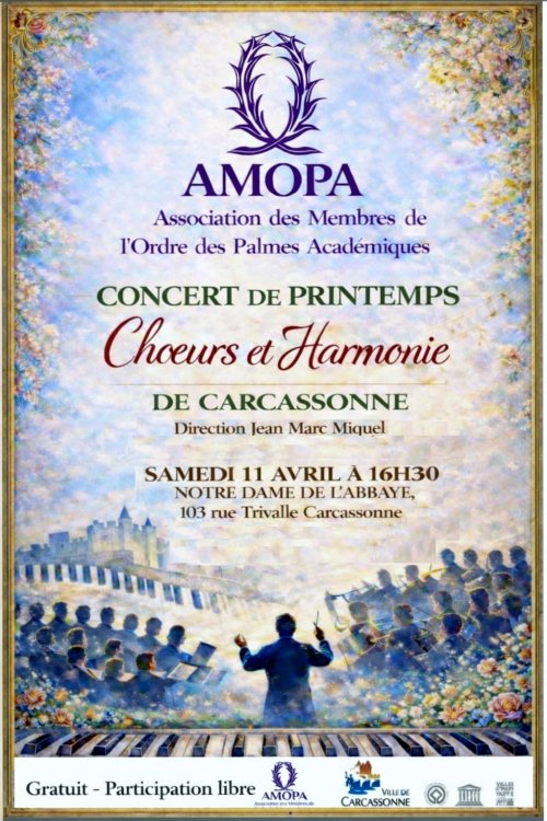 Agenda des manifestations Concert de Printemps Musique Notre Dame de l’Abbaye samedi 11 avril de 16h30 à 19h30 Notre Dame de l’Abbaye Depuis plusieurs années, une collaboration s'est instaurée entre les Chœurs de Carcassonne et l'Orchestre d'Harmonie de Carcassonne De plus en plus de compositeurs écrivent pour chœurs et orchestre d'harmonie et font des arrangements d’œuvres classiques ou modernes. De ce double constat est née l'idée de développer le travail de collaboration entre les deux formations sous la direction de Jean-Marc MIQUEL Zoom de l'image © Choeurs de Carcassonne Participation libre