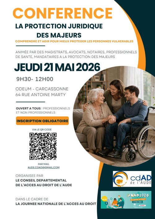 Agenda des manifestations Conférence : la protection juridique des majeurs Conférence L'Odeum Social / Santé /Solidarité jeudi 21 mai de 9h30 à 12h00 L'Odeum Conférence organisée par le Conseil Départemental de l'Accès au Droit de l'Aude dans le cadre de la journée nationale de l'accès au droit, pour comprendre et agir pour mieux protéger les personnes vulnérables. Animée par des magistrats, avocats, notaires, professionnels de santé, mandataires à la protection des majeurs. Sur le Web Inscription obligatoire Zoom de l'image Tarif(s) Ouvert à tous sur inscription Contact Le Conseil Départemental de l'Accès au Droit de l'Aude (CDAC11) aude.cdad@gmail.com