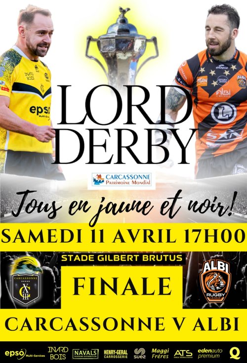 Agenda des manifestations Finale de la coupe de France Lord Derby 2026 : Carcassonne XIII / Albi Rugby League Sport samedi 11 avril 17h00 Stade Gilbert Brutus av. de l'aérodrome 66000 Perpignan Tous à Perpignan pour la finale de la Coupe de France Lord Derby 2026 ! Le samedi 11 avril à 17h00 au Stade Gilbert Brutus à Perpignan. Venez nombreux soutenir votre équipe. Les supporters de Carcassonne XIII seront Tribune Guash-Laborde. 13h30 Départ du Stade Albert Domec (trajet en bus 20€). Réserver vos places au 06.81.29.08.92 ou 06.43.22.44.15 17h coup d'envoi 20h soirée retour de finale au stade Albert Domec. Grillade géante, buvette et musique Venez nombreux pour faire la fête en présence des joueurs, du staff, des bénévoles et des dirigeants. Sur le Web Achat des billets uniquement sur le site de FFR XIII Zoom de l'image Tarif(s) Entrée générale 15€ Etudiants 5€ Gratuit : PMR et pour les -13ans Votre contact Carcassonne XIII 04 68 77 59 01 contact@carcassonne13.fr Plus d'informations...