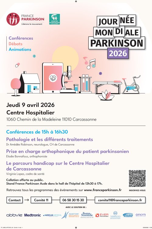 Agenda des manifestations Journée mondiale de la maladie de Parkinson Autres Centre hospitalier de Carcassonne jeudi 9 avril 13h30 Centre hospitalier de Carcassonne À l’occasion de la Journée mondiale de la maladie de Parkinson, le Centre Hospitalier de Carcassonne, en collaboration avec l’association France Parkinson, organise un après-midi dédié à l’information, à la prévention et au dialogue autour de cette maladie neurologique qui touche plus de 270 000 personnes en France. Cet événement, ouvert à tous, s’adresse aux patients, aux proches aidants ainsi qu’à toute personne souhaitant mieux comprendre la maladie de Parkinson et les ressources existantes pour accompagner les personnes concernées. Le rendez-vous est donné le mercredi 9 avril au Centre Hospitalier de Carcassonne. Dès 13h30, des stands d’information seront installés dans le hall de l’hôpital. Le public pourra y rencontrer des représentants de France Parkinson – comité de l’Aude ainsi que de l’Espace Seniors de la Ville de Carcassonne, qui seront présents pour informer, orienter et répondre aux questions des visiteurs. À 15h, des conférences se tiendront à l’amphithéâtre du Centre Hospitalier, jusqu’à 16h30, afin d’apporter un éclairage médical et pratique sur la maladie de Parkinson, ses symptômes, sa prise en charge et l’accompagnement des patients et de leurs proches. Inscrivez-vous Zoom de l'image