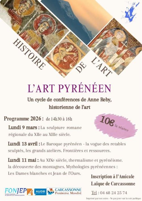 Agenda des manifestations L'art pyrénéen : Le Baroque pyrénéen Conférence Amicale Laïque de Carcassonne Culture lundi 13 avril de 14h30 à 16h00 Amicale Laïque de Carcassonne Un cycle de conférences de Anne Reby, historienne de l'art. Le Baroque pyrénéen - la vogue des retables sculptés, les grands ateliers. Frontières et ressources. Inscription auprès de l'Amicale Laïque de Carcassonne : 04 68 24 25 74 Zoom de l'image Tarif(s) 10€