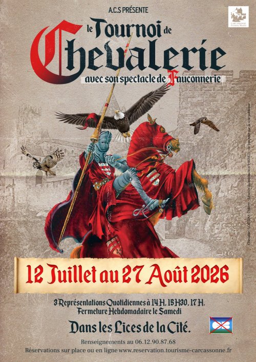 Agenda des manifestations Le Tournoi de chevalerie avec son spectacle de Fauconnerie Autres Cité Médiévale Jusqu'au 27 août, tous les jours sauf le samedi Cité Médiévale Ce tournoi médiéval évoque l'art de la guerre. Au rythme des chevaux et par le choc des armes, les chevaliers s'affrontent sans merci, dans un décor grandiose. Spectacle familial, d'une durée de 45 mn, proposant des places assises et ombragées en tribune. Le Placement pour le spectacle est libre. Il n'y a pas de numérotation. 3 séances par jour à 14h - 15h30 - 17h, TOUS LES JOURS SAUF LE SAMEDI Renseignement au 06.12.90.87.68 Zoom de l'image Achetez vos places