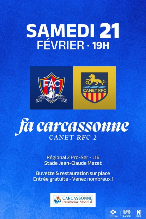 Agenda des manifestations Match de Football : FA Carcassonne / Canet RFC 2 Sport Stade Jean-Claude Mazet samedi 21 février 19h00 Stade Jean-Claude Mazet Régional 2 Pro-Ser - J16.Buvette et restauration sur place. Venez soutenir votre équipe ! Zoom de l'image Gratuit