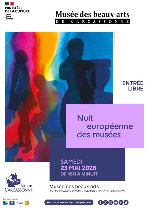 Agenda des manifestations Nuit européenne des musées Musée des Beaux-Arts Exposition Musée des Beaux-Arts Culture samedi 23 mai de 16h00 à 23h59 Musée des Beaux-Arts Dans le cadre de l’édition 2026 de la Nuit européenne des musées, le Musée des beaux-arts de Carcassonne vous invite à une immersion fantastique dans « La Forêt de Monstres ». Venez parcourir les collections permanentes à la découverte de créatures mythologiques et fantastiques, entre imaginaire et folklore. Profitez également d’une exposition, réalisée par les élèves des classes de CP et CE1 de l’école Jean-Beaubois de Montlegun, autour du thème « Des animaux et des créatures ». Un spectacle mêlant chants, danses et défilés sera organisé à 16h30, dans la cour du musée, ainsi qu’une présentation de dessins de tatouages (sur le thème de l’engagement), par des collégiens et lycéens de la ville. Pour les plus joueurs d’entre vous, la soirée se poursuivra dès 20h, avec un jeu de piste autour des animaux présents dans les œuvres (à partir de 6 ans, accompagné). Une expérience artistique et ludique à partager en famille ! Zoom de l'image Tarif(s) Entrée libre Votre contact Musée des Beaux-Arts - Accueil 15 boulevard Camille Pelletan Tarif : Entrée gratuiteHoraires d'ouverture :Du 1er octobre au 31 mars : du mardi au samedi de 10h à 12h30 et de 13h30 à 18h (fermé le dimanche et lundi)Ouvert le 1er dimanche du mois de 14h à 17hFermé les jours fériésDu 1er avril au 30 septembre : tous les jours de 10h à 12h30 et de 13h30 à 18hFermé les jours fériésAvant toute visite de groupe libre ou guidée, il est nécessaire de s'adresser au musée des beaux-arts de Carcassonne par mail à musee@mairie-carcassonne.fr afin de vérifier les disponibilités des créneaux horaires. 04 68 77 73 70 musee@mairie-carcassonne.fr