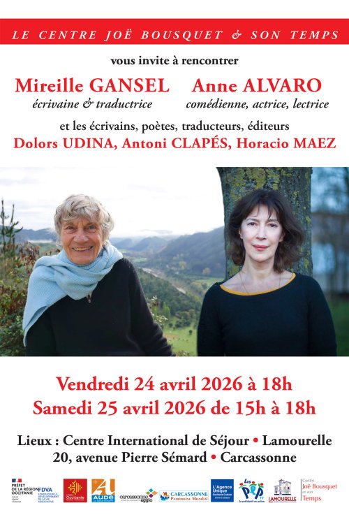 Agenda des manifestations Rencontre avec Mireille Gansel et Anne Alvaro Conférence Centre International de Séjour Lamourelle vendredi 24 avril au samedi 25 avril Centre International de Séjour Lamourelle le Centre Joë Bousquet & son temps vous invite à rencontrer Mireille Gansel, écrivaine & traductrice, Anne Alvaro, comédienne, actrice, lectrice et les écrivains, poètes, traducteurs, éditeurs : Dolors Udina, Antoni Clapés, Horacio Maez Zoom de l'image