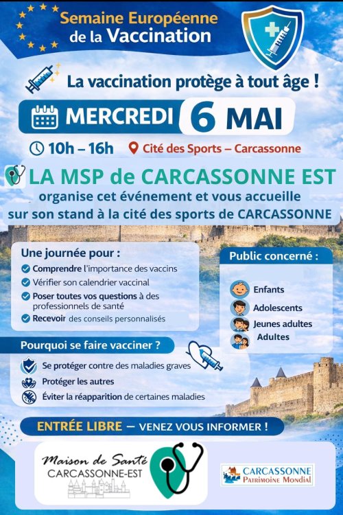 Agenda des manifestations Semaine Européenne de la vaccination Portes ouvertes Cité des sports Social / Santé /Solidarité mercredi 6 mai de 10h00 à 16h00 Cité des sports La MSP de Carcassonne Est organise une journée de sensibilisation sur la vaccination. Une journée pour : Comprendre l'importance des vaccins Vérifier son calendrier vaccinal Poser toutes vos questions à des professionnels de santé Recevoir des conseils personnalisés Zoom de l'image