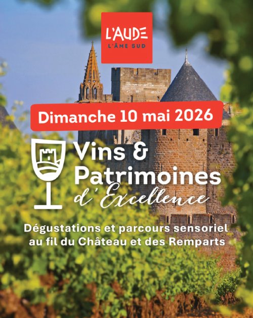Agenda des manifestations Le CMN et l’ ADT de l’ Aude présentent Vins et Patrimoines d’excellence Autres Château Comtal dimanche 10 mai Château Comtal Une journée exceptionnelle entre vin et patrimoine à la Cité de Carcassonne Une journée placée sous le signe du vin et de la découverte du paysage : dégustations et rencontres avec les vignerons au cœur du Château et remparts de la Cité de Carcassonne. Une immersion dans le patrimoine viticole audois Le dimanche 10 mai 2026, l’ADT de l’Aude et le Centre des monuments nationaux proposent une journée exceptionnelle dédiée à la découverte des vins du territoire et à la mise en valeur des paysages viticoles. De 10h à 17h, les visiteurs pourront rencontrer les vignerons et profiter de dégustations réparties en neuf étapes à travers le monument. Ce parcours permettra de découvrir la richesse des terroirs audois, entre savoir-faire viticole et 2 500 ans d’histoire. L’ événement est organisé en partenariat avec l’ Agence de développement touristique de l’Aude, le Conseil interprofessionnel des vins du Languedoc, le Syndicat du cru Minervois, le Syndicat du cru Corbières et la Chambre d’agriculture de l’Aude. Informations pratiques Date : dimanche 10 mai 2026Horaires : de 10h à 17hTarifs : 25 euros et pour les 18-25 ans : 5 euros Lieu : Château et remparts de la Cité de Carcassonne Accès : événement inclus dans le parcours de visite du Château Comtal (conditions habituelles d’accès) Sur le Web www.remparts-carcassonne.fr Zoom de l'image Achetez vos places Payant